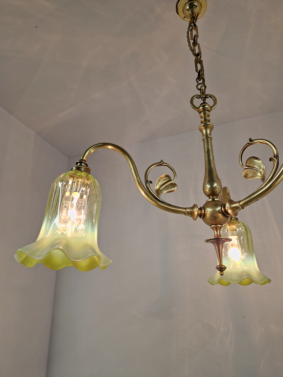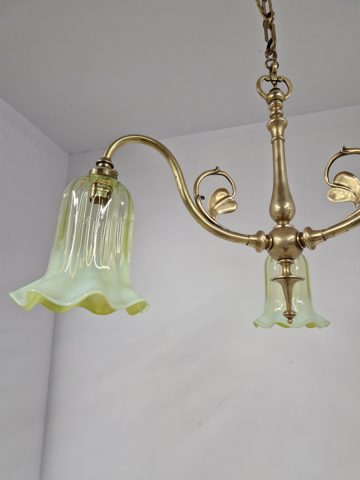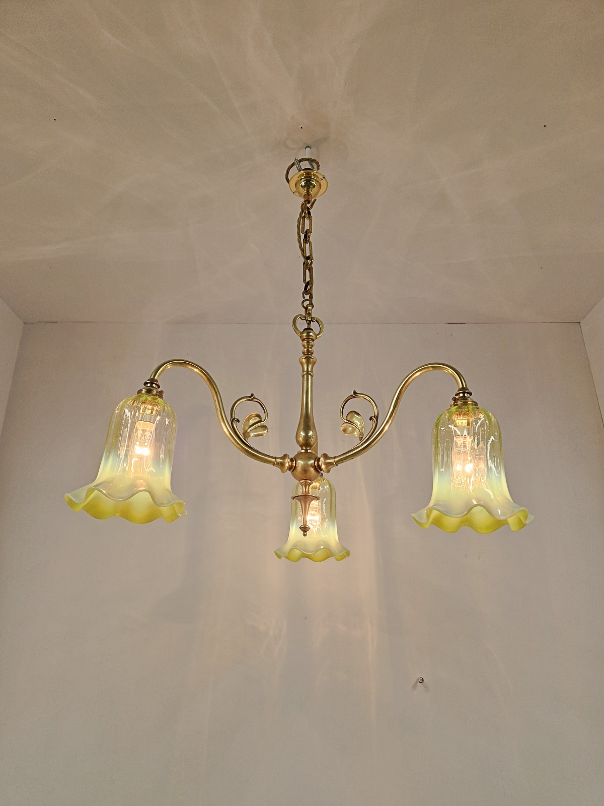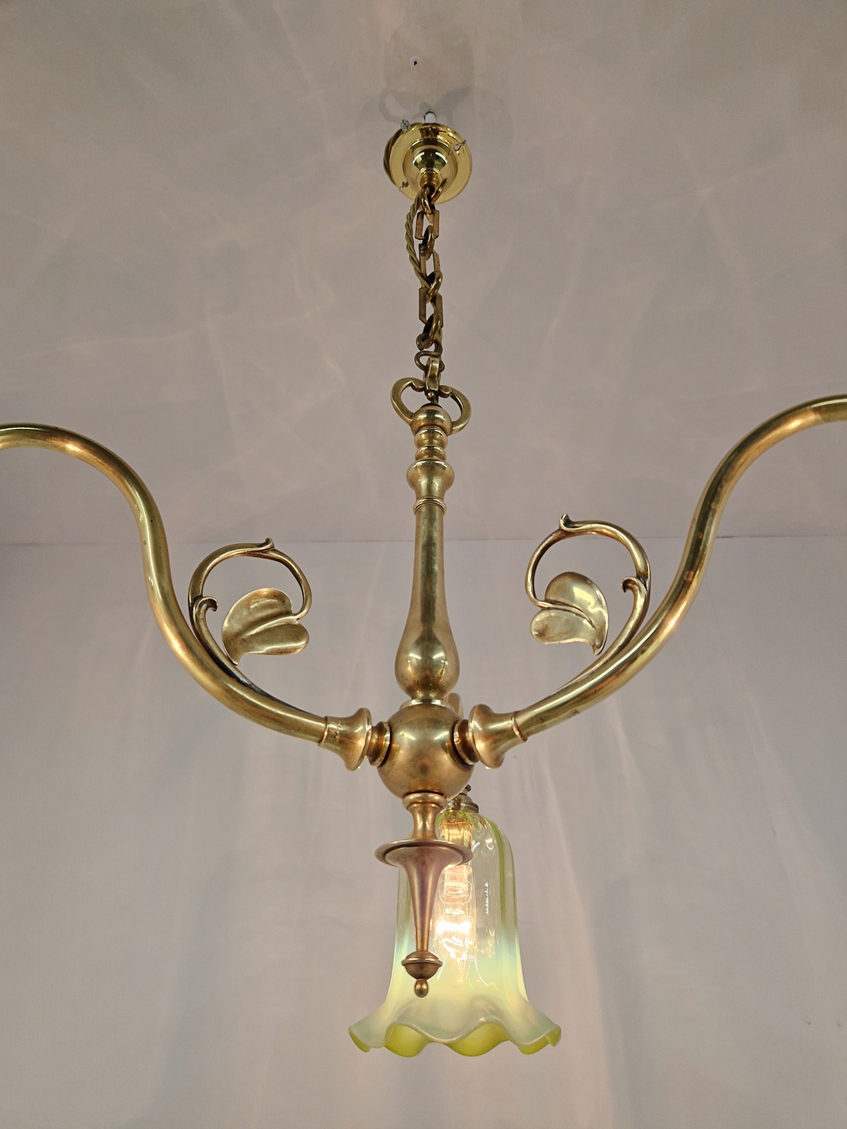 Product Code: JAL1136NS009A traditional brass three-arm ceiling fitting designed in a simple art nouveau style by an unknown designer complimented with reproduction vaseline-glass lampshade. Original period chain and replacement ceiling hook for suspension. England c.1920