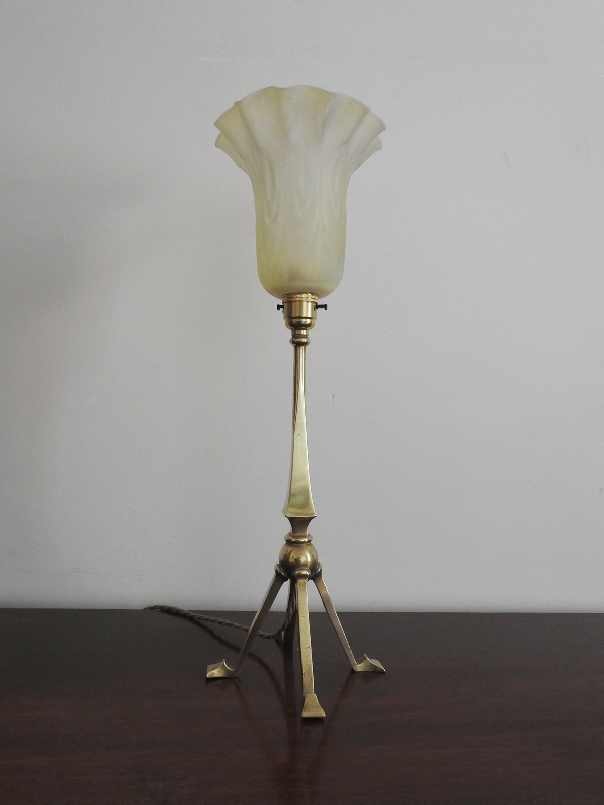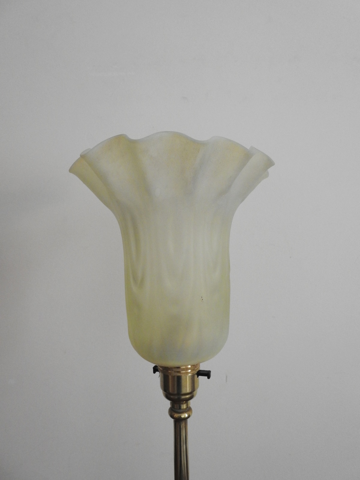 Product Code: JAL0621cAn Edwardian cast brass table lamp with trefoil base supporting an attractive vaseline-glass lampshade .England c1905