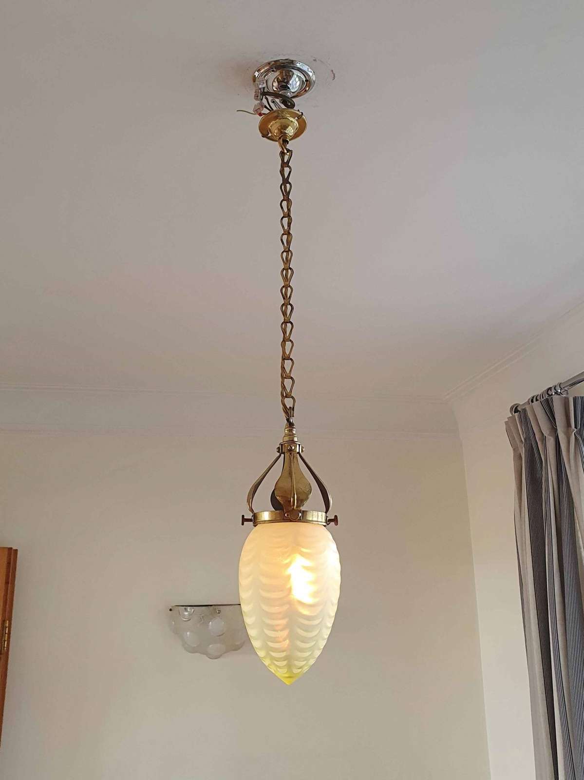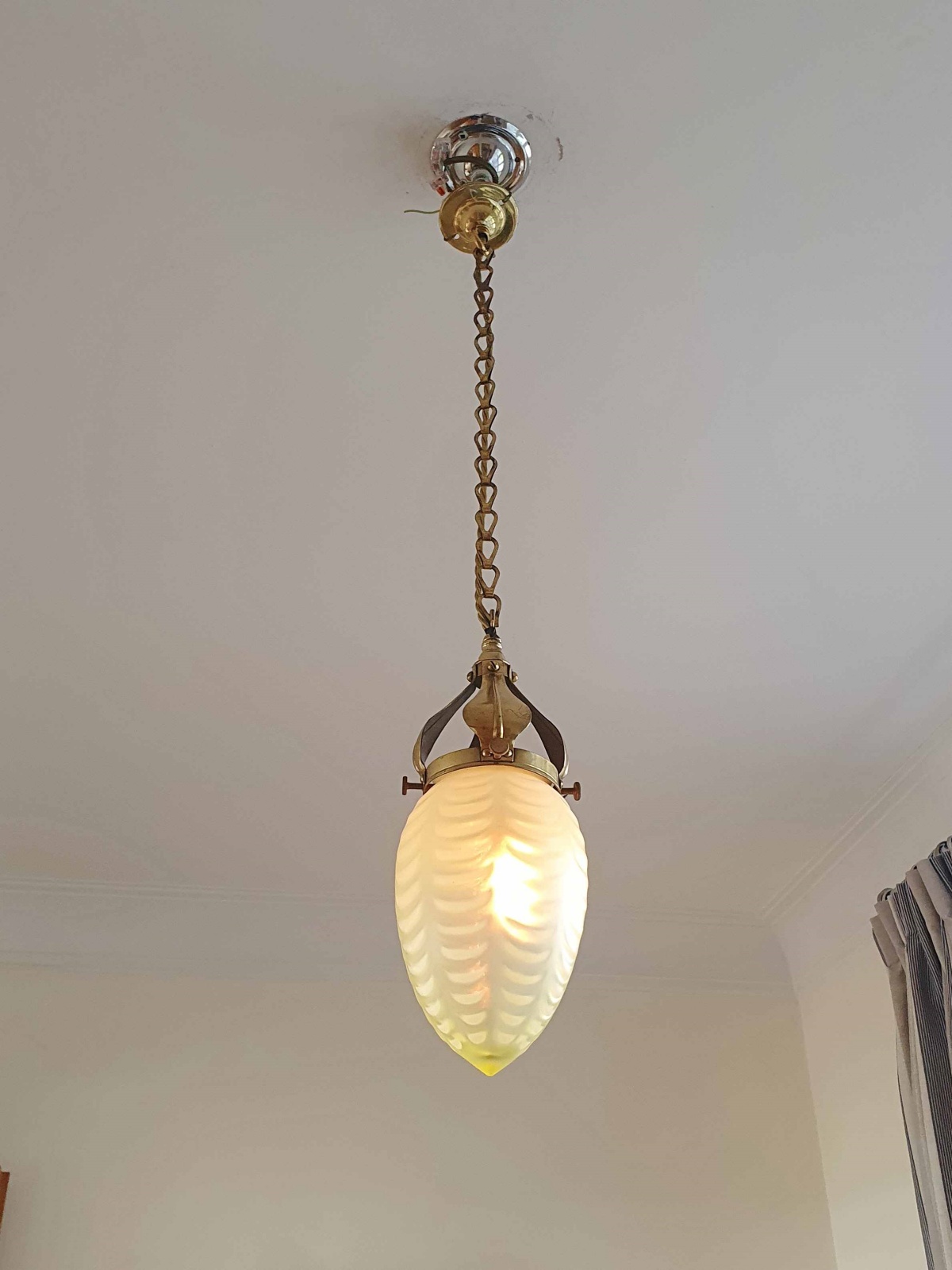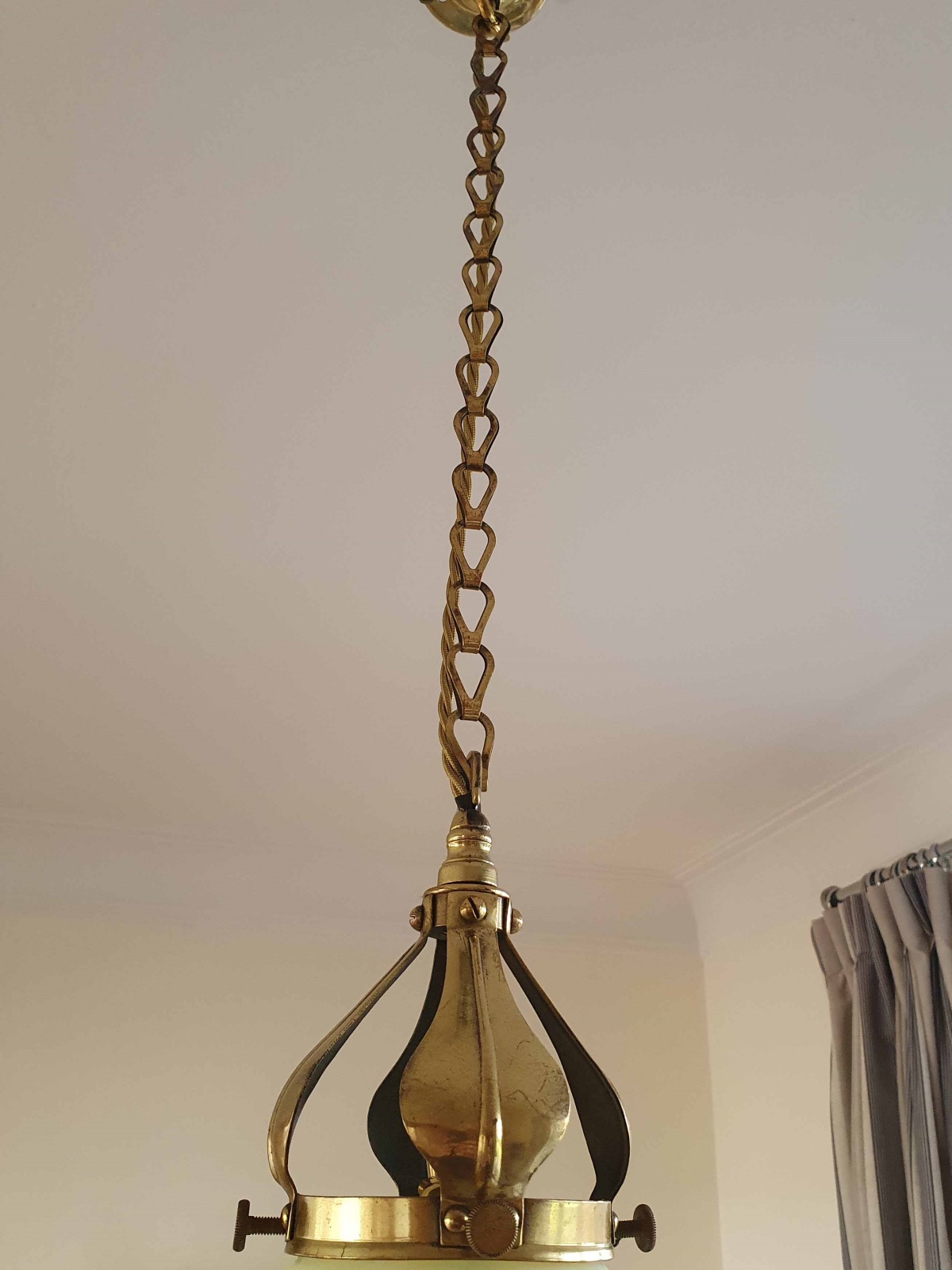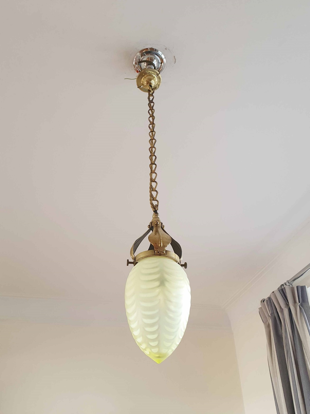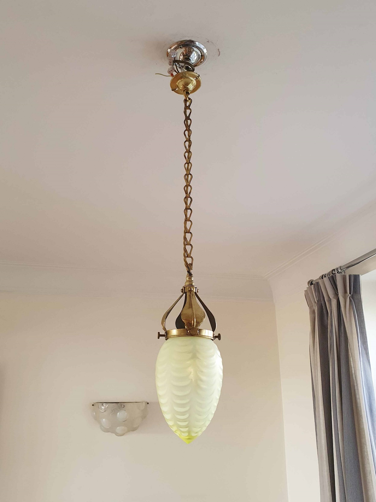 Product Code: JAL1064A fine example of an English arts and crafts hall pendant. The original brass gallery and chain supporting a very good quality large straw-vaseline globe lampshade most probably produced at Stourbridge. England c.1900