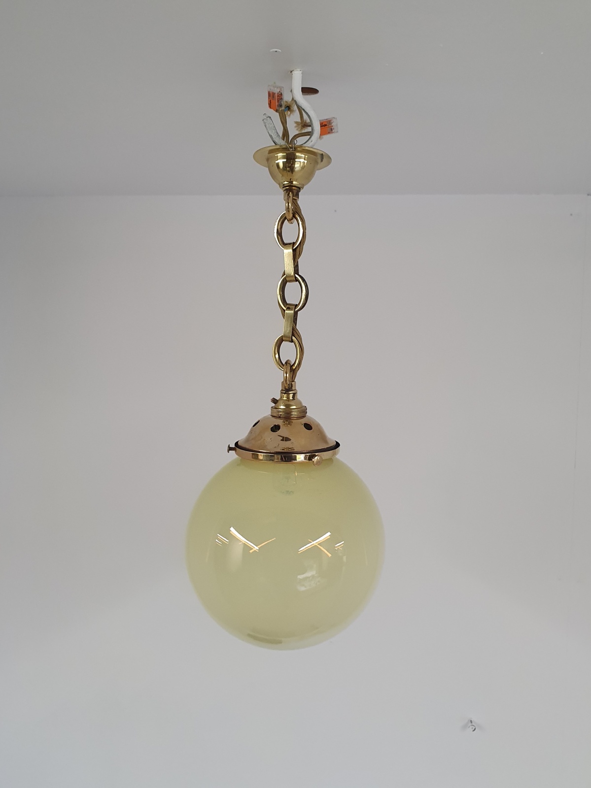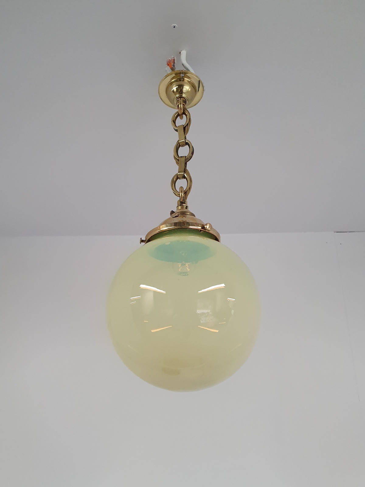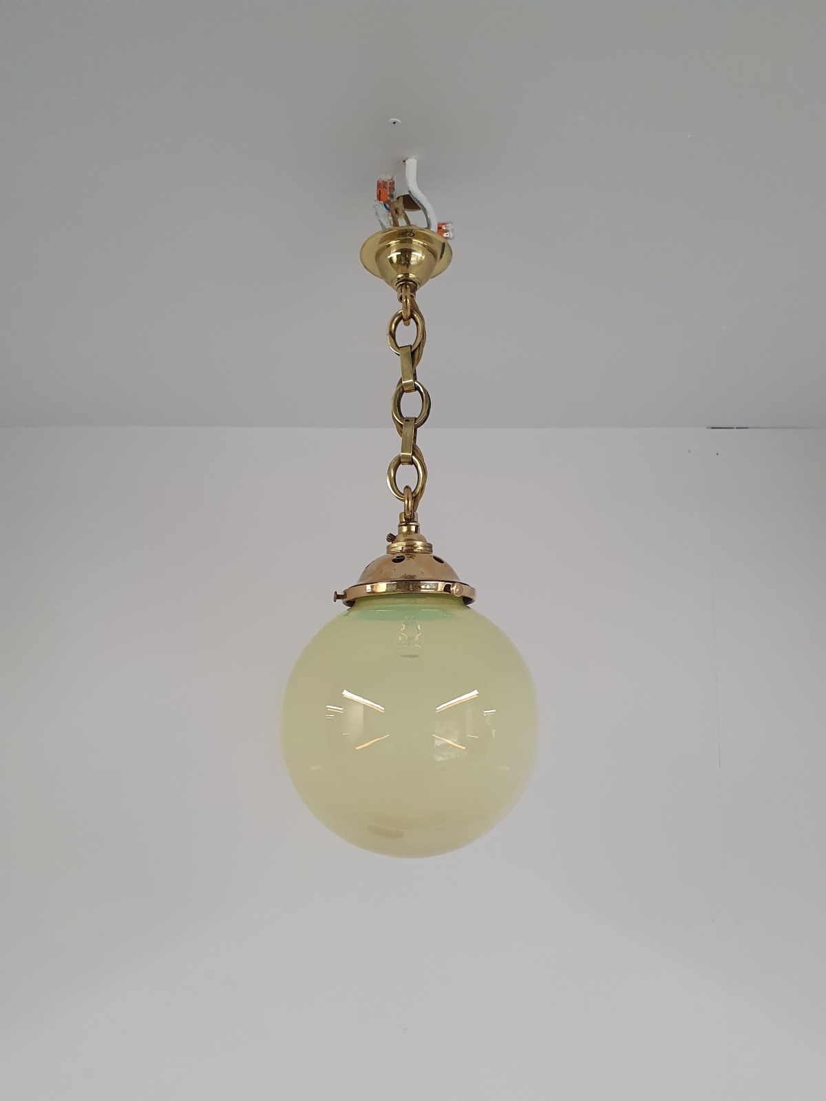 A vaseline-glass globe pendant with original cast brass fitments for suspension and replacement ceiling hook. England early c.20th