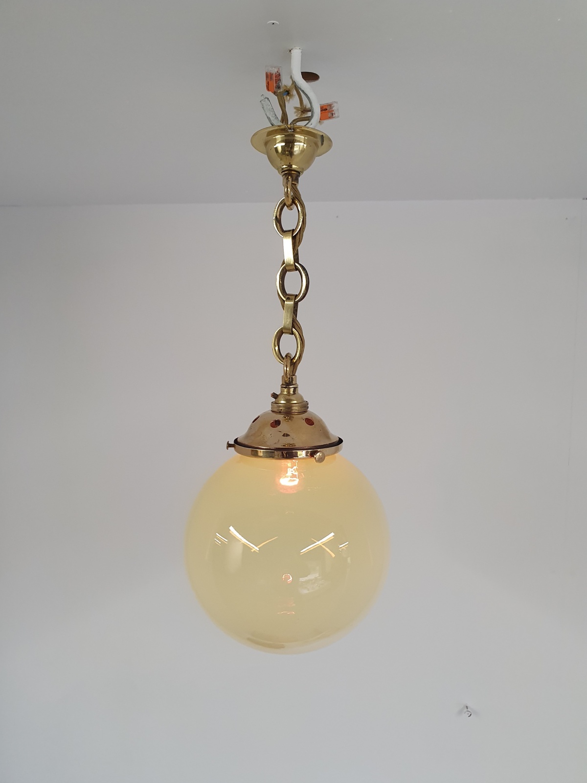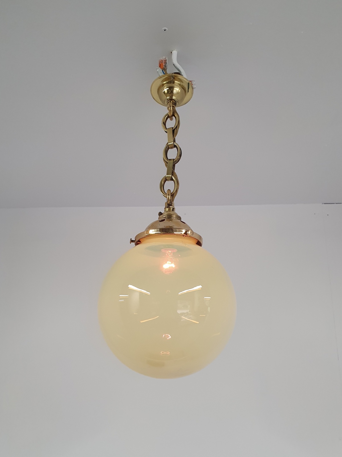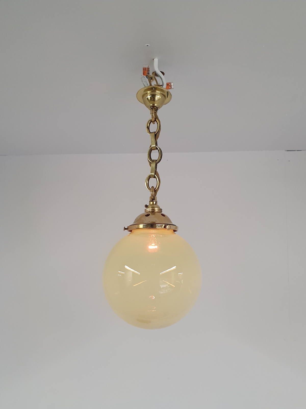 A vaseline-glass globe pendant with original cast brass fitments for suspension and replacement ceiling hook. England early c.20th