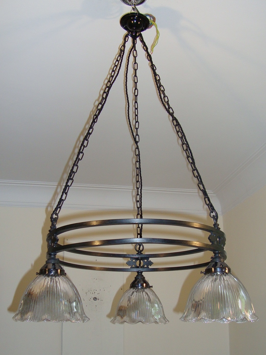 Product Code: JAL0557A pair of neo-gothic style wrought-iron ceiling lamps by an unknown designer complimented with signed Holophane Company optic-glass lampshades. England, early c.20th.