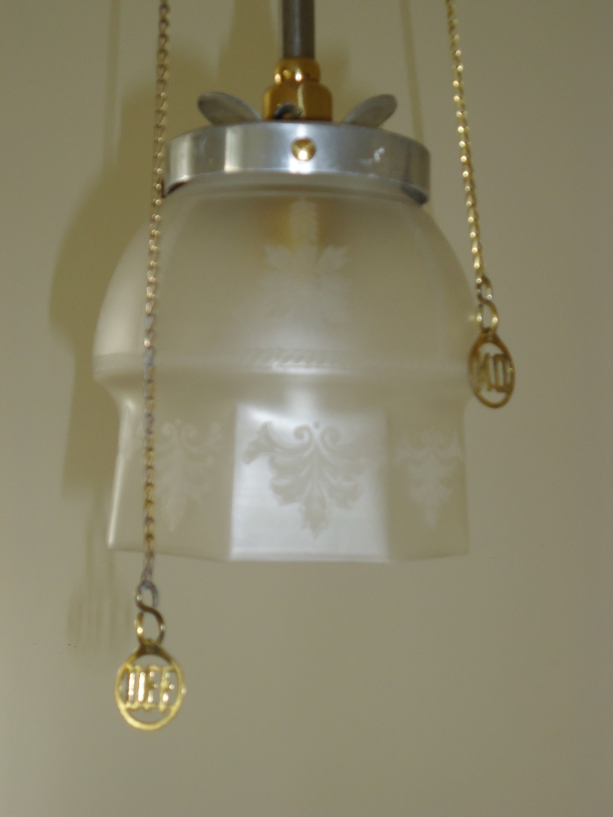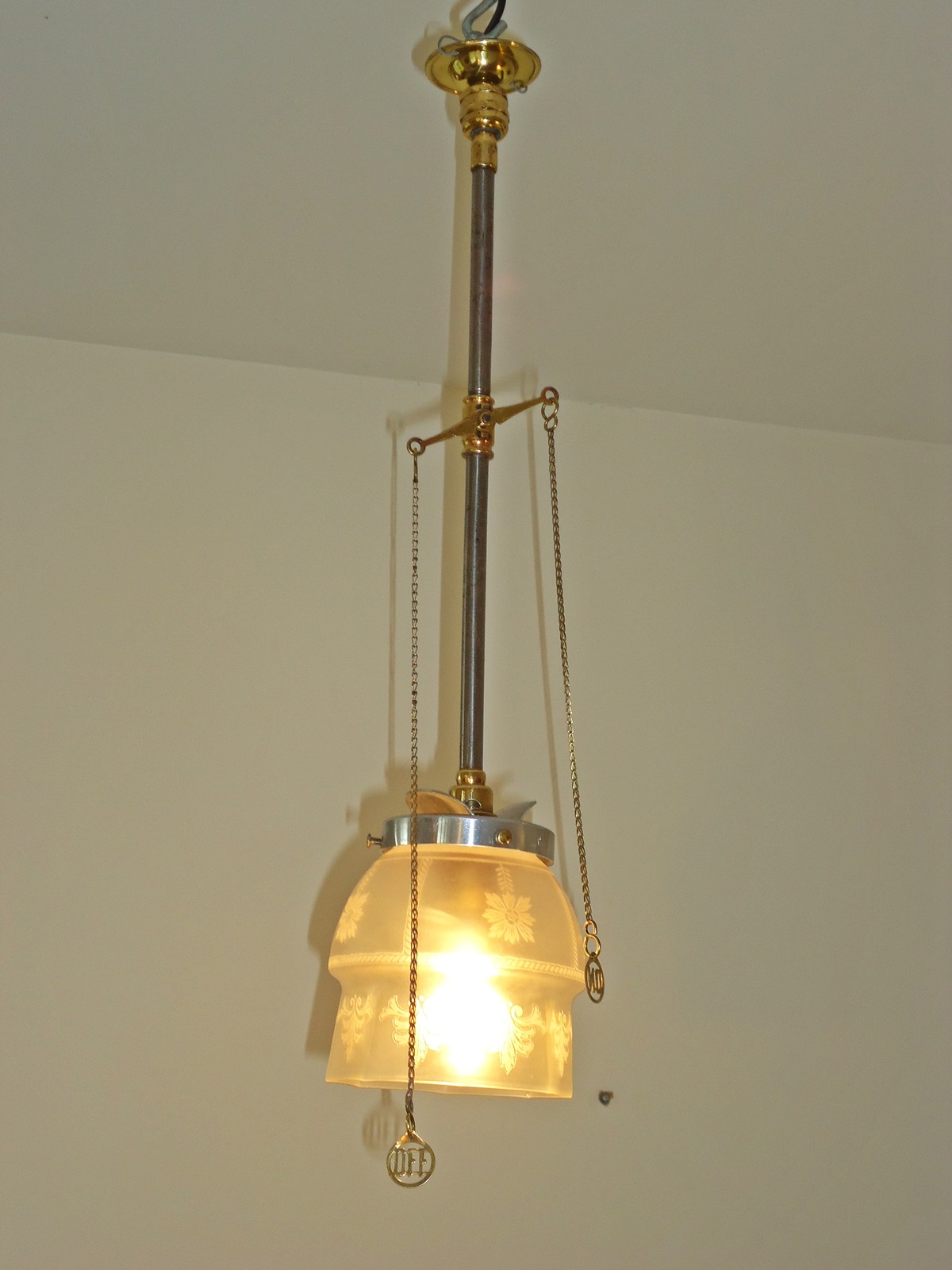 Product Code: JAL0620aA Veritas iron and brass hanging gas fitting with a frosted and acid-etched lampshade. With “RD 774818” for 1905 England.