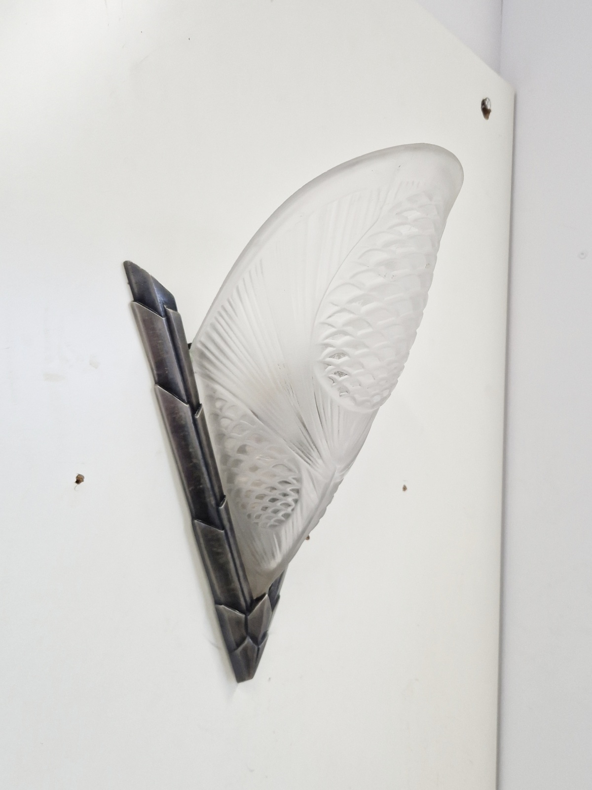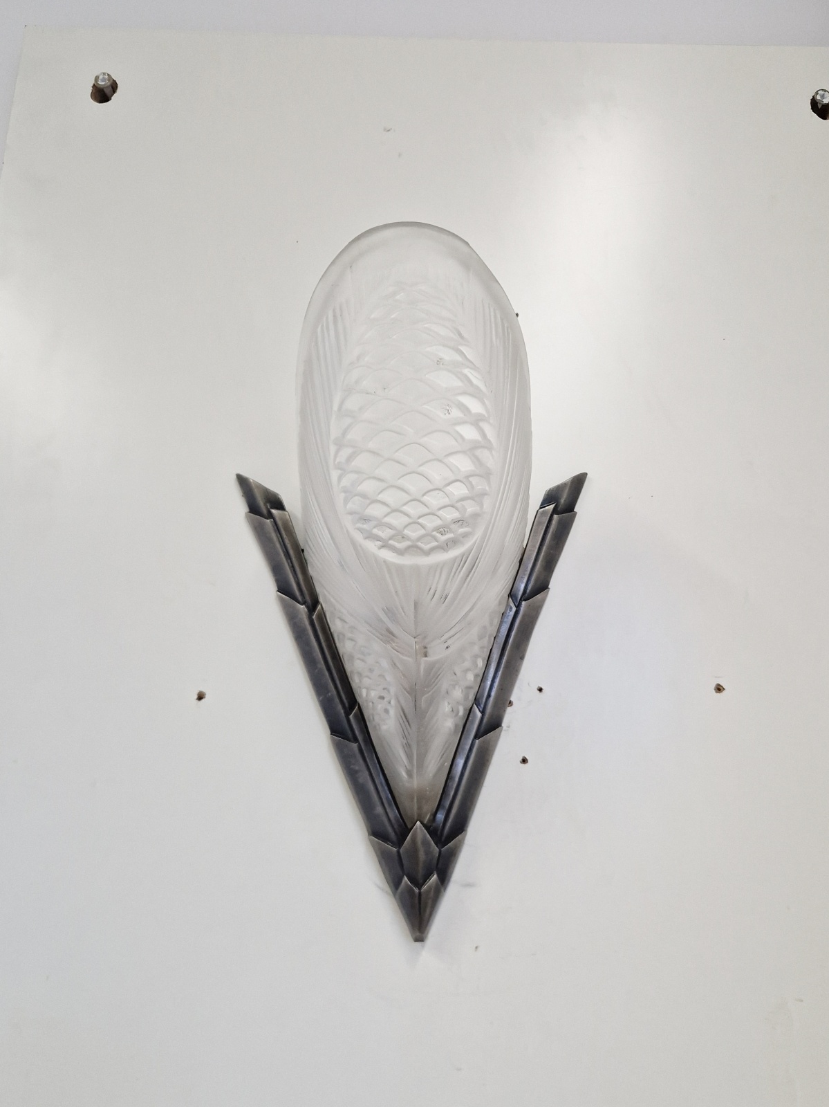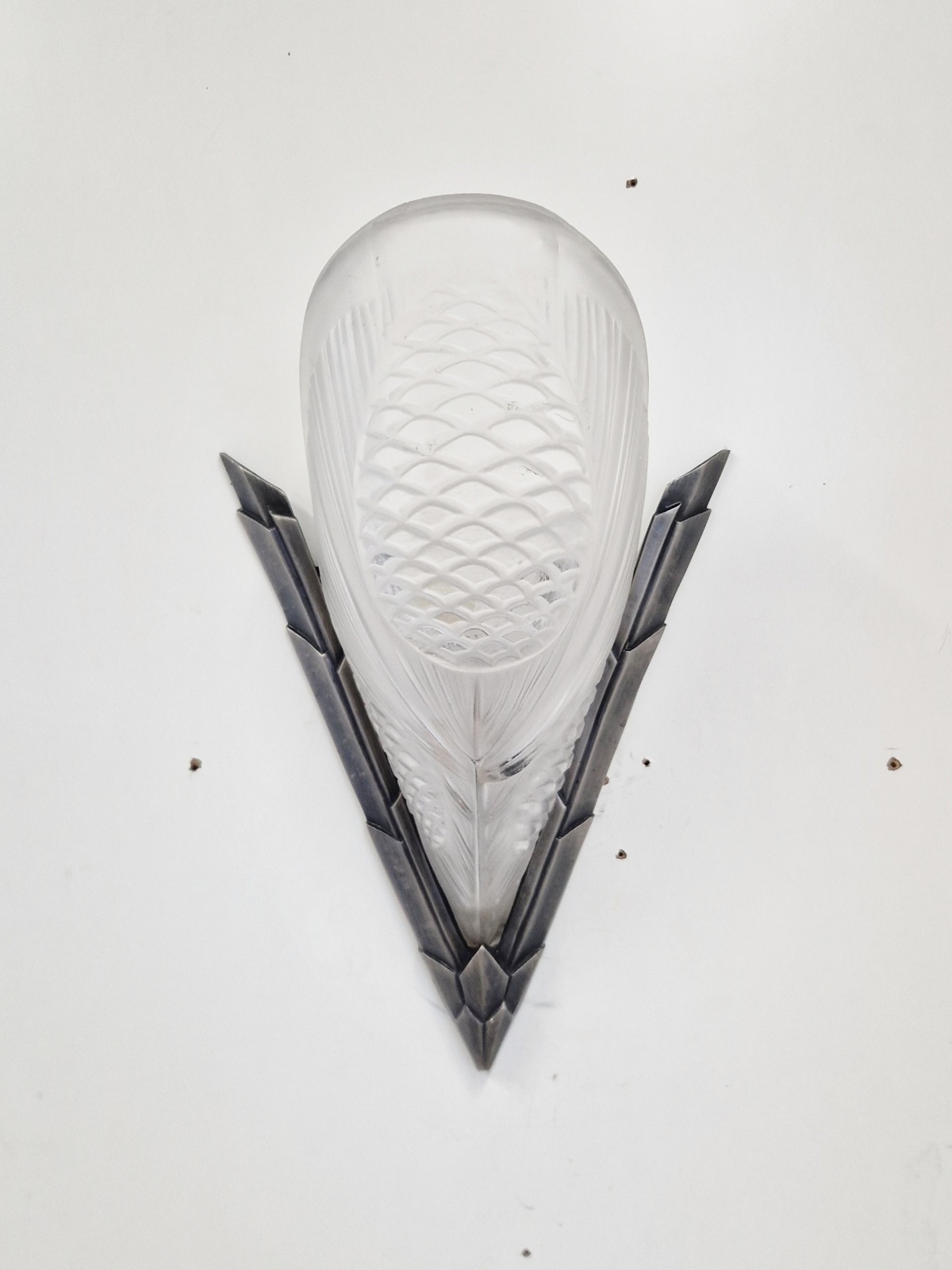 Product Code: LG695A pair of stylish art deco wall lights by Degué, the original dark nickel mounts each supporting a frosted and polished glass plaque designed in pine cones. France c.1930. The glass is apparently unsigned.