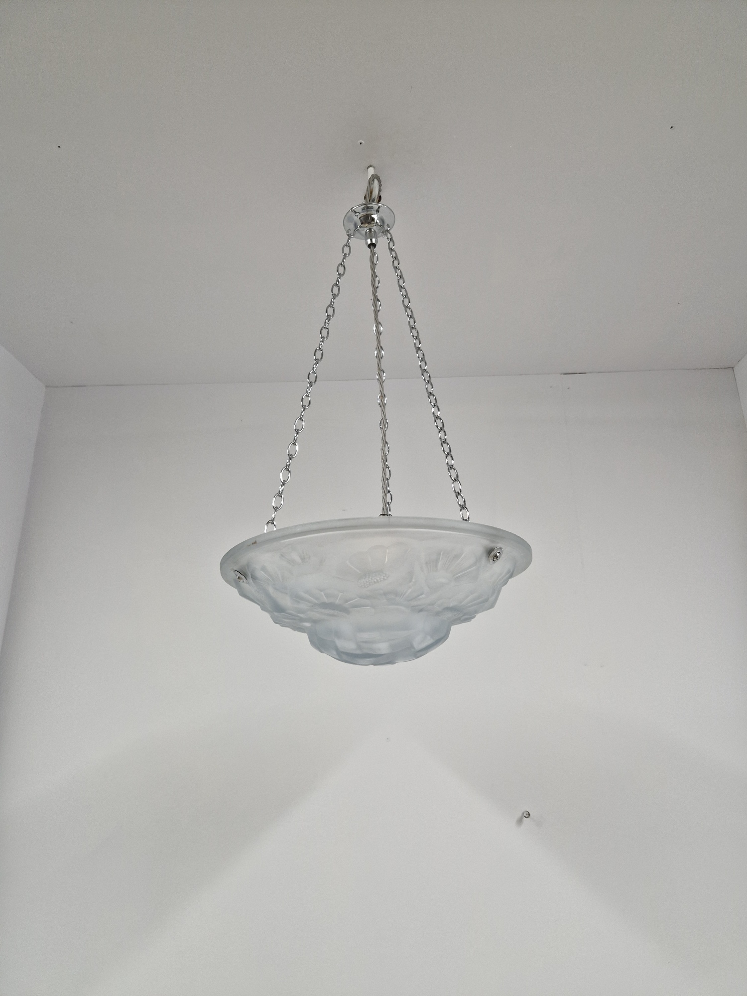Product Code: JAL1143A good quality frosted-glass art deco plafonnier designed with stylised flowerheads signed Degué displayed with replacement chromed fitments for suspension. France c.1930