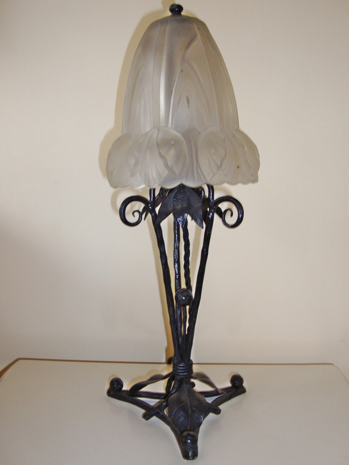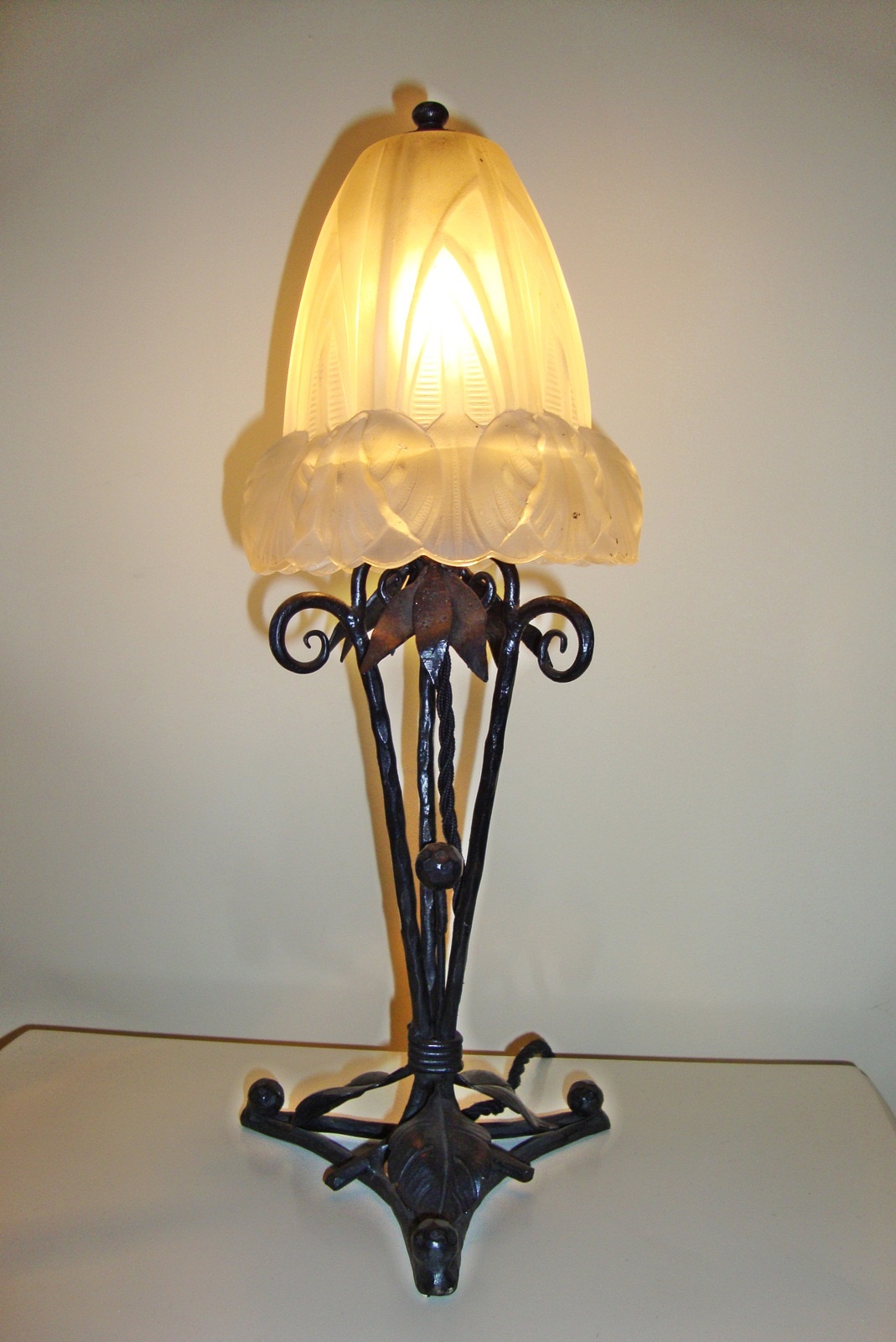 A wrought iron “mushroom” art deco table lamp the deeply moulded lampshade by Verrerie D’art Degué but apparently unsigned. France c1930