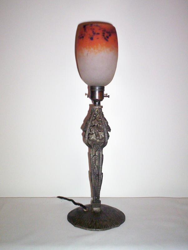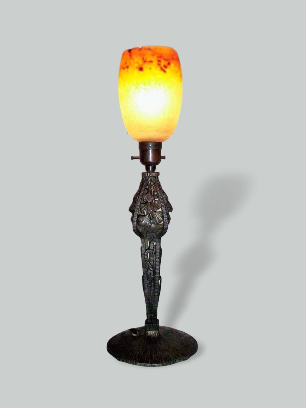 Product Code: LG026A French table lamp designed with gingko leaves and stylised ferns, probably made from pewter and in the style of Henri Fournet, signed in the base “Made In France” & “606”, supporting a “pate-de-verre” lampshade with acid-stencilled signature “Degue”. France, c.1925.