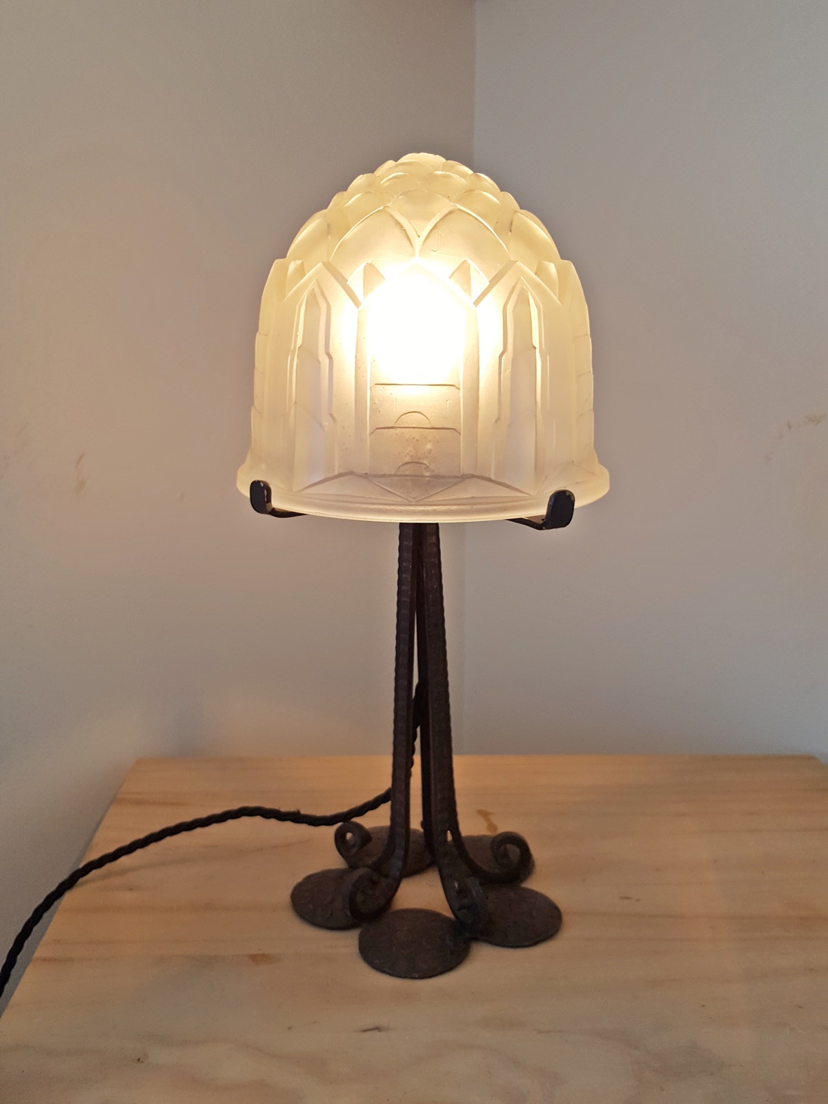 Product Code: JAL0062A wrought-iron and moulded-glass art deco “mushroom” table lamp, the glass signed “Des Hanots”. France, c.1930.