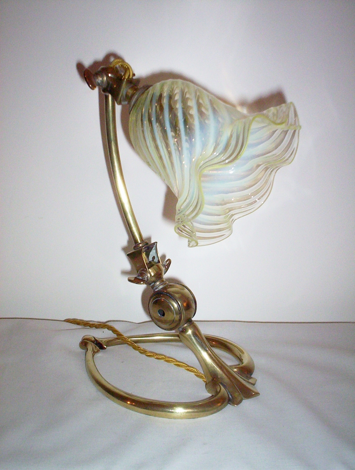 Product Code: LG027A good quality arts and crafts table lamp by W.A.S Benson with good quality vaseline glass lampshade possibly by James Powell & Sons. England c.1905