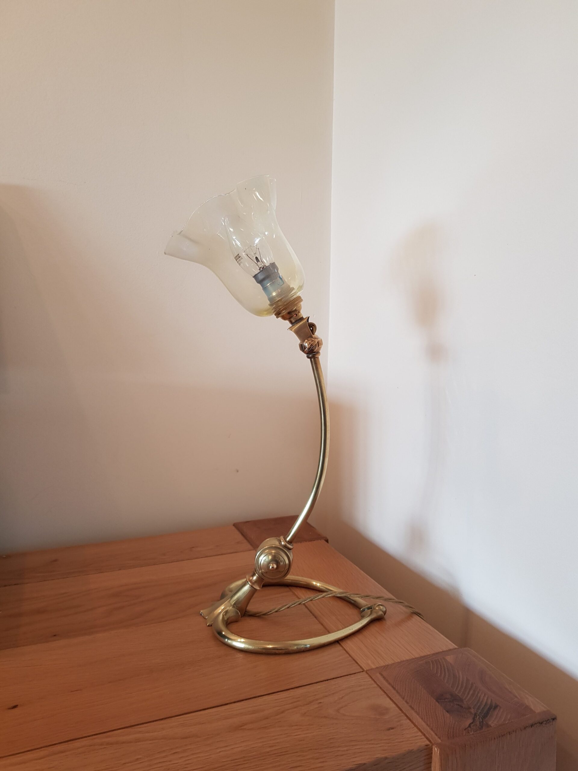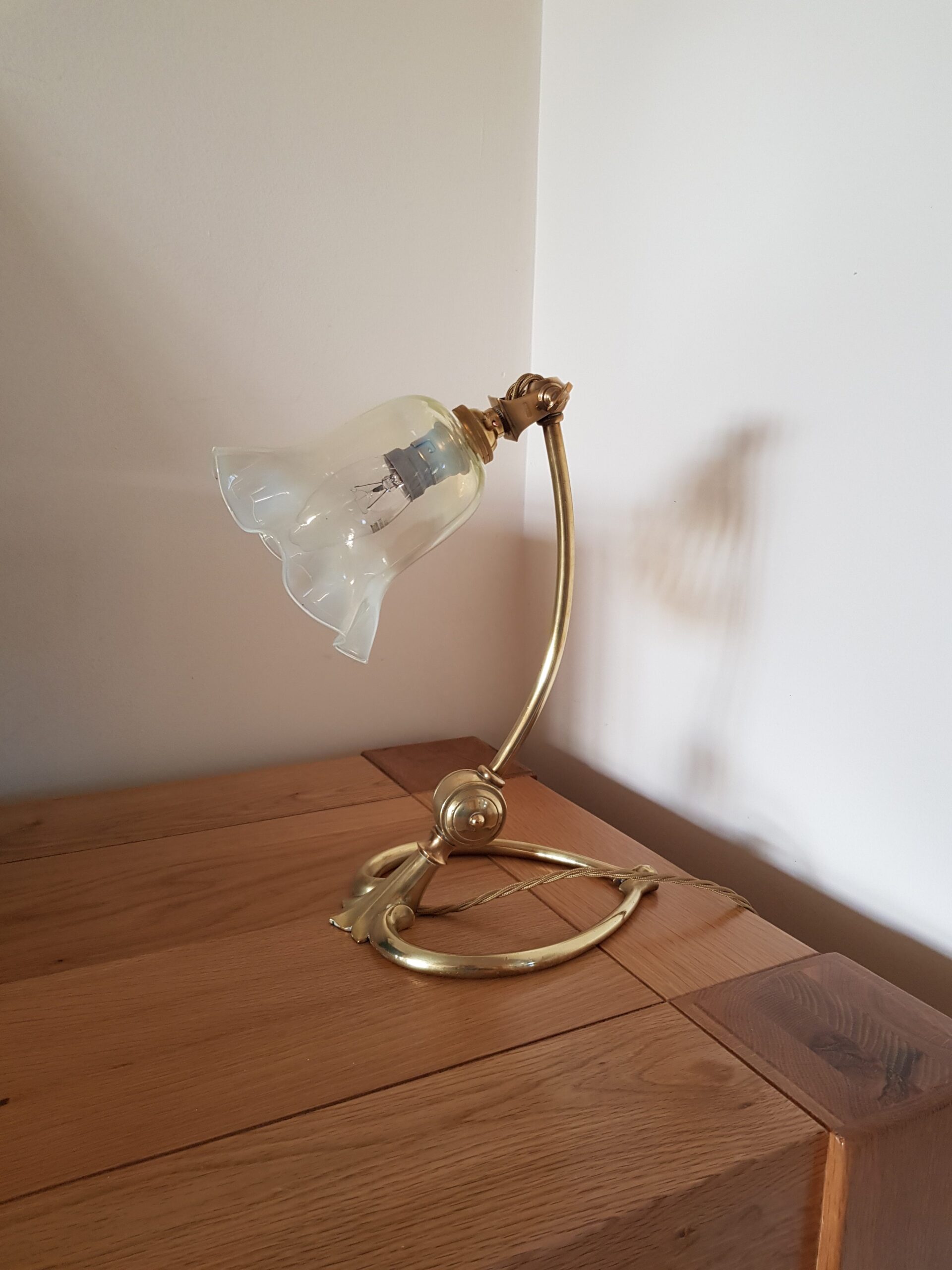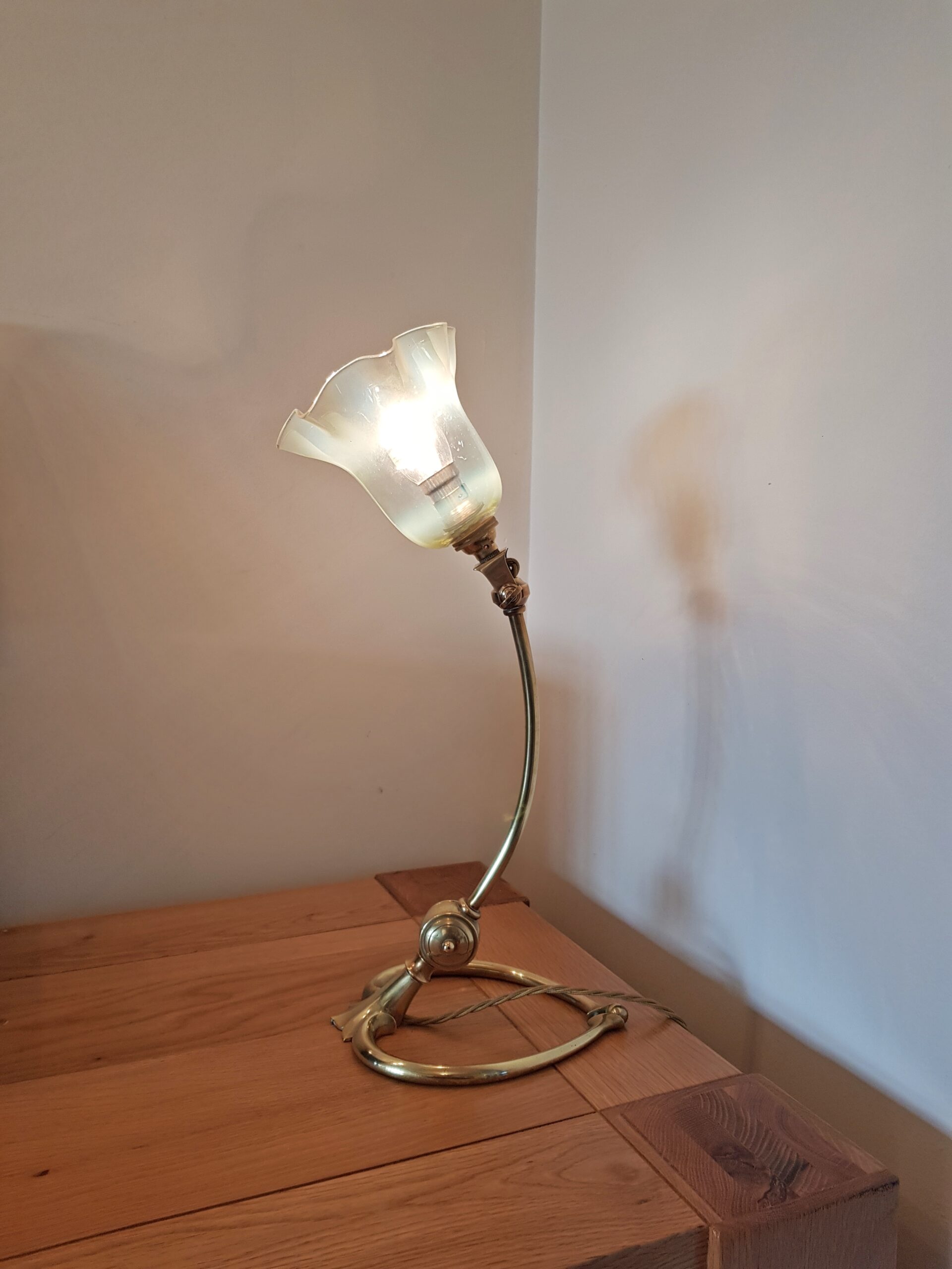 Product Code: JAL0982A good quality multi-adjustable cast-brass art nouveau desk lamp signed by W.A.S Benson, complimented with an original vaseline-glass lampshade.