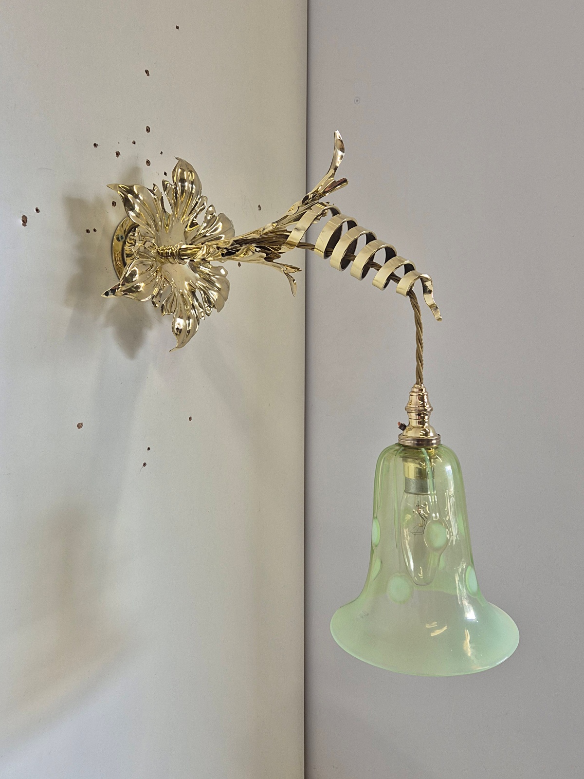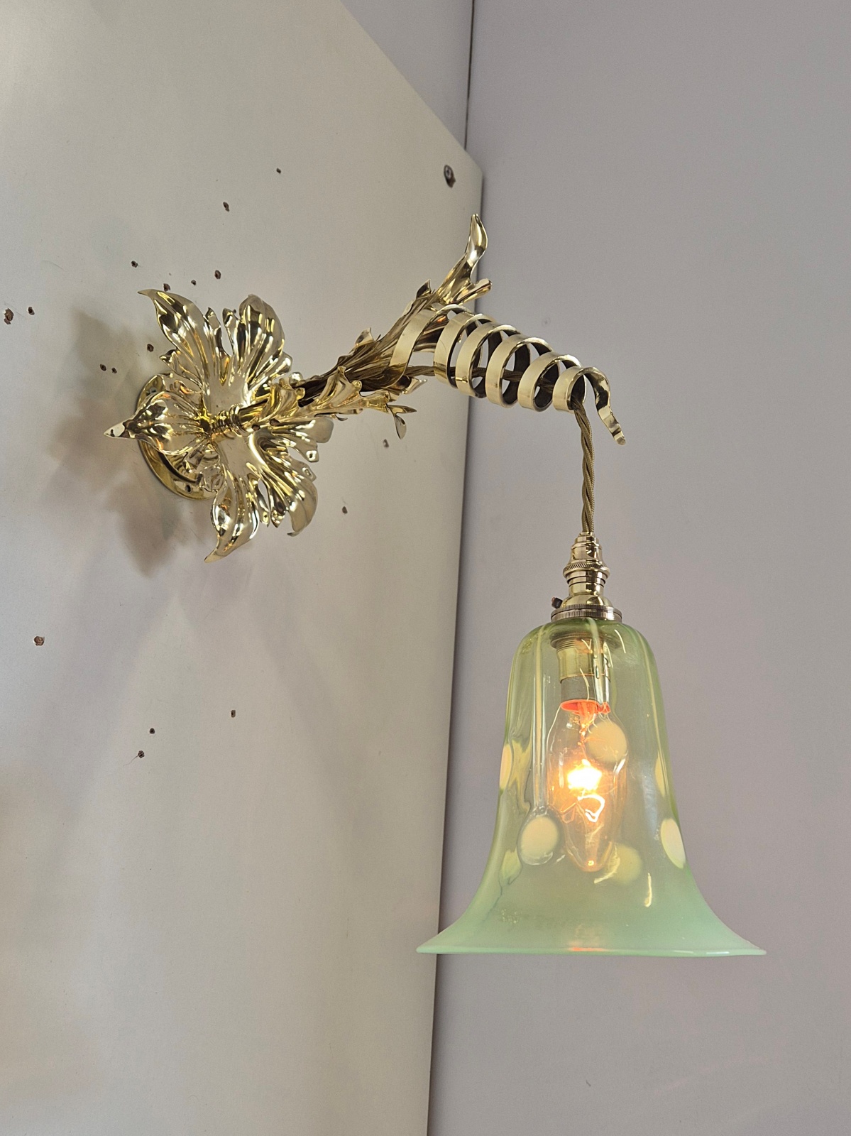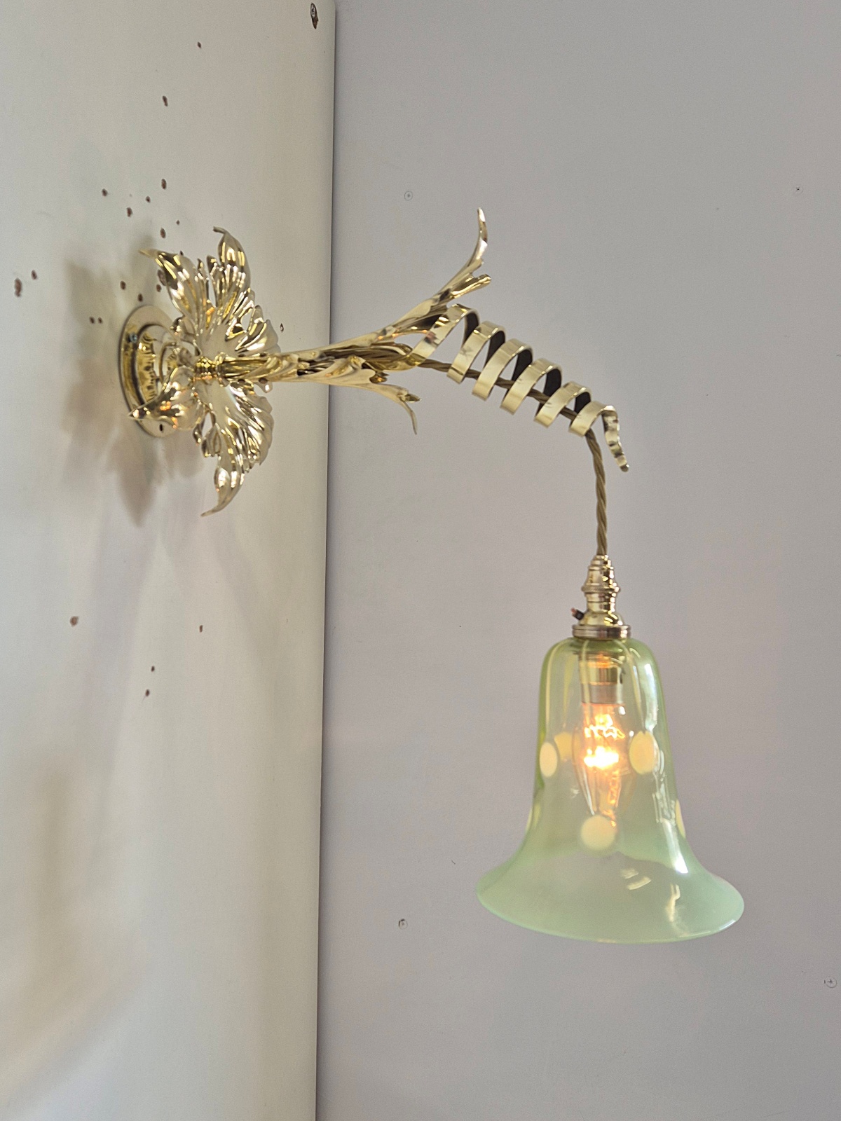 Product Code: JAL1249VAS065A rare and important pair of Arts & Crafts wall lights designed and signed by William Arthur Smith Benson. The decorative wall lights designed with heavy cast-brass swirling fronds synonymous with Benson designs. The wall lights are now complimented with original John Walsh Walsh vaseline glass lampshades in the registered “Stripe & Dot” pattern No.436269. England c1900