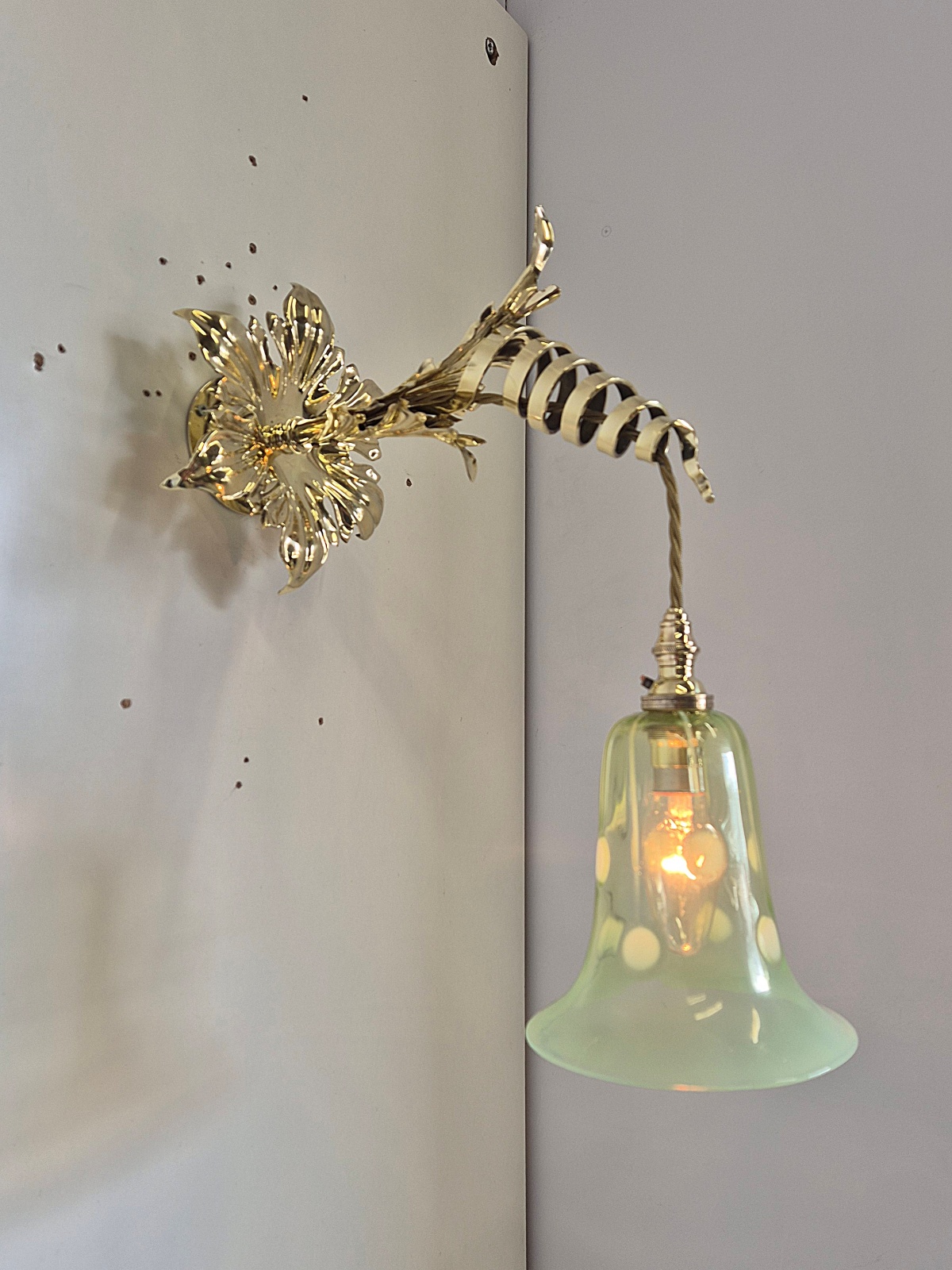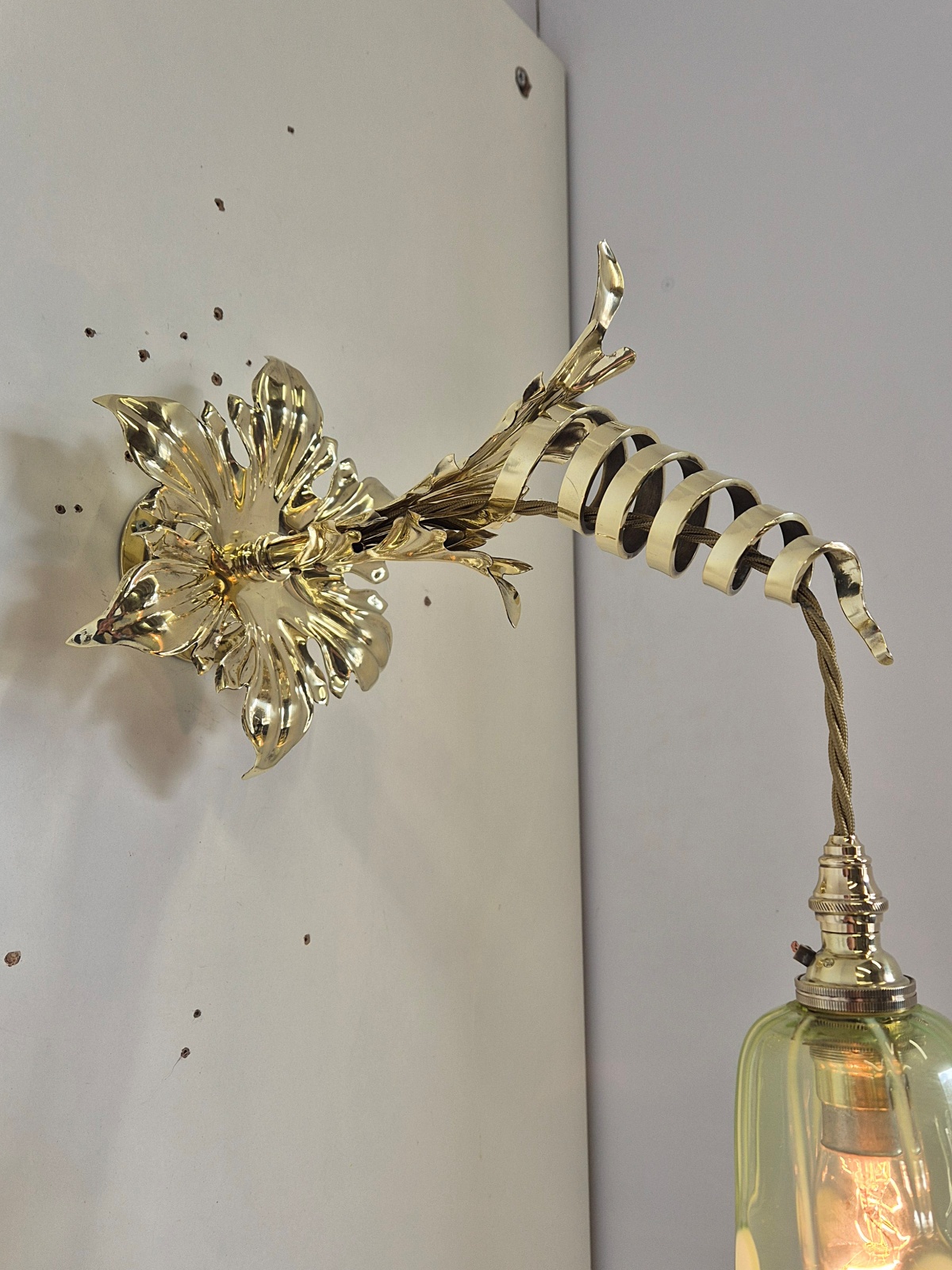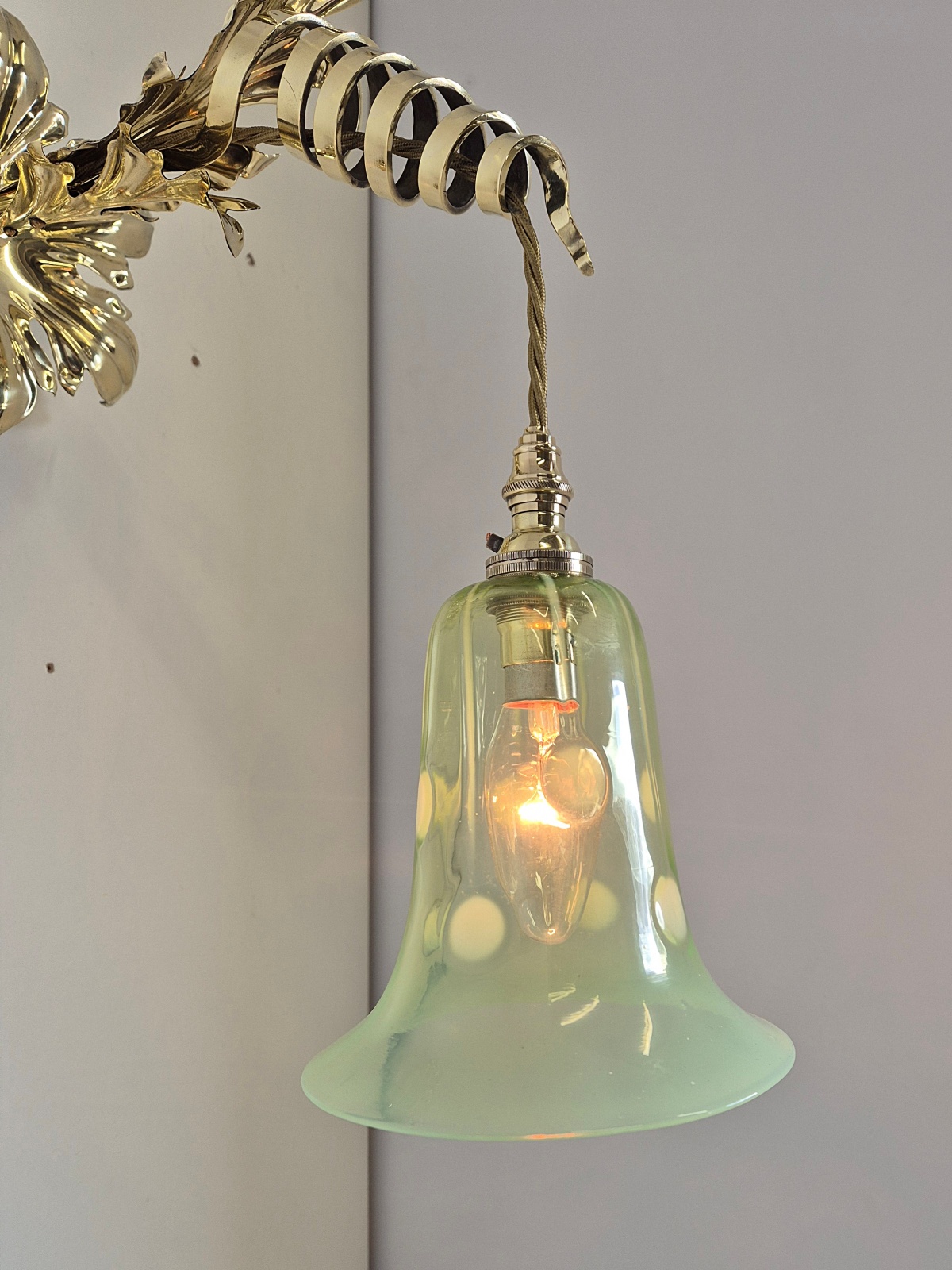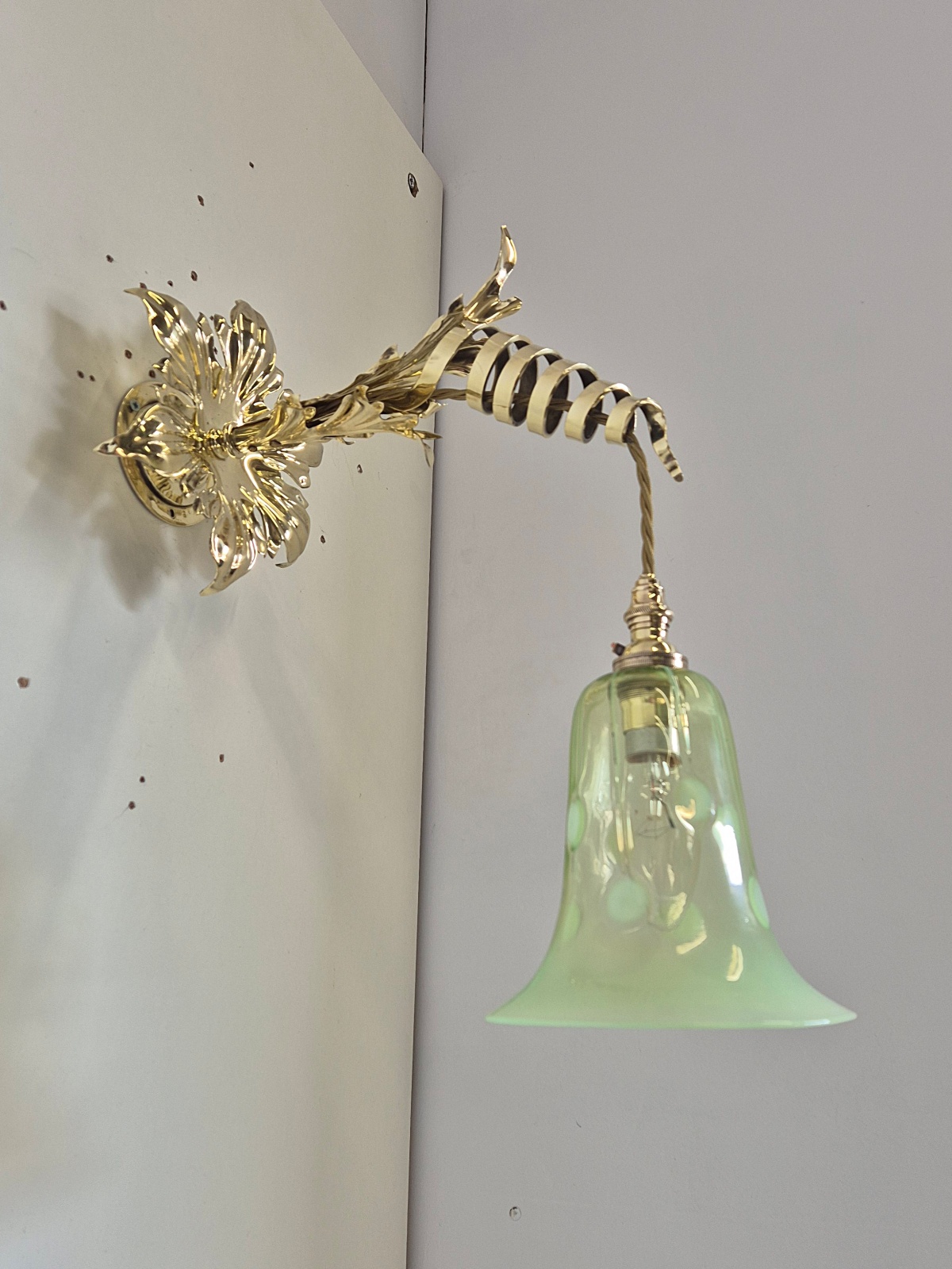 Product Code: JAL1249VAS065A rare and important pair of Arts & Crafts wall lights designed and signed by William Arthur Smith Benson. The decorative wall lights designed with heavy cast-brass swirling fronds synonymous with Benson designs. The wall lights are now complimented with original John Walsh Walsh vaseline glass lampshades in the registered “Stripe & Dot” pattern No.436269. England c1900